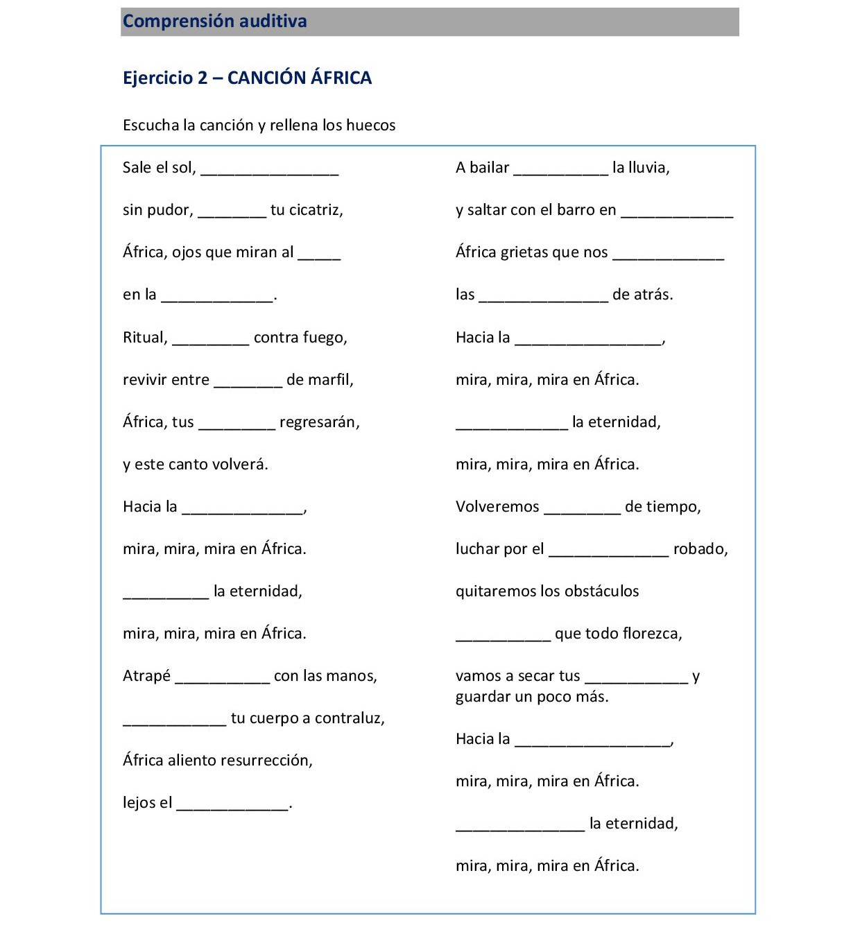 NIVEL 2. Actividad 9: 5 de junio de 2020 EJERCICIO 1 EJERCICIO 2 Audio del ejercicio 2 https://ojala.itakaescolapios.org/wp-content/uploads/2020/06/CANCIÓN-ÁFRICA.mp3 EJERCICIO 3 EJERCICIO 4