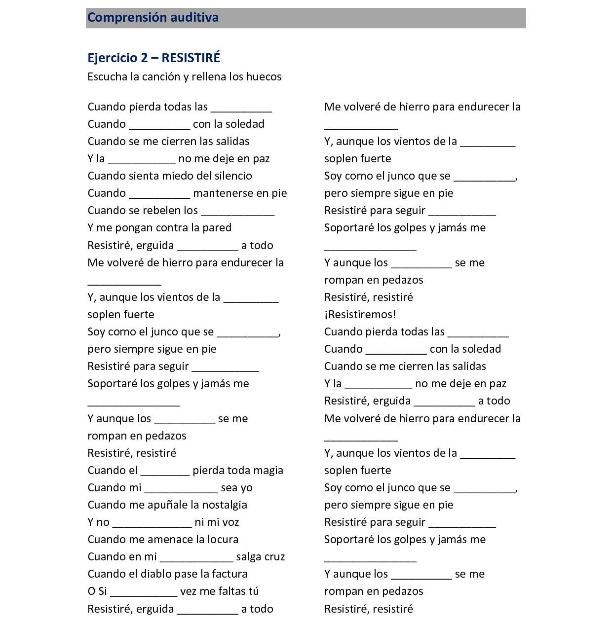 NIVEL 2. Actividad 15: 19 de junio de 2020 EJERCICIO 1 EJERCICIO 2 Audio del ejercicio 2 https://ojala.itakaescolapios.org/wp-content/uploads/2020/06/Resistiré-2020.mp3 EJERCICIO 3 EJERCICIO 4 EJERCICIO 5